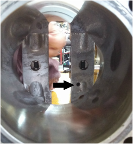 The three pictures below show the placement of the injector that exits oil out of the crankshaft cradle. The top picture below shows the crankcase cradle and the white arrows point to the exit openings for the oil nozzles on one bank of cylinders. The second picture has a cylinder placed in front of the oil nozzle to show the relative location of each part. The black arrow points to the oil injector’s outlet. The third picture below shows where the oil winds up after being sprayed. You will note that all the oil has been sprayed in a horizontal direction and none toward the top of the cylinder. This can be problematic for three cylinders at cold start up.
