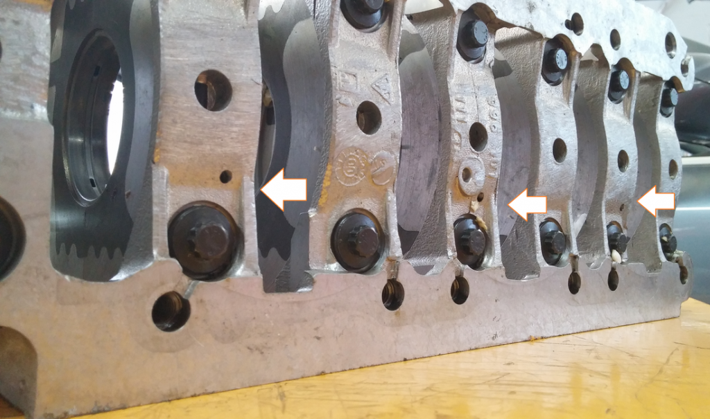 The 996 engine crankshaft is designed with an approximate 50mm distance between bearing 7 (left pointer above) and the crankshaft seal surface (right pointer above). Additionally the chain driven by the crankshaft is located at the back of the engine (looking toward front of the car). The pressures from these combined forces cause excessive vibrations on the crankshaft and the fulcrum point has no relief beyond the chain and flywheel.